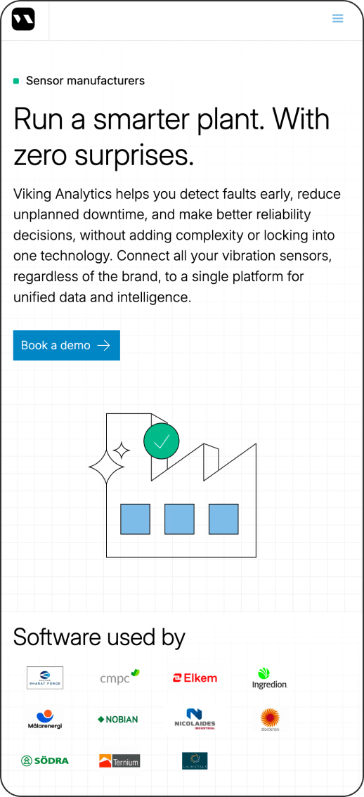 We rebuilt Viking Analytics' entire public-facing presence from the ground up – rethinking the site structure, segmenting the offer around specific customer types, and writing messaging that spoke directly to how each of them buys. Deep SEO and search-intent analysis shaped the architecture. We defined the structure, wrote the copy, shaped the brand direction, produced the visual design and imagery, and launched in Webflow. A blog content layer strengthened authority in industrial reliability, vibration analysis, predictive maintenance, and AI-based monitoring.